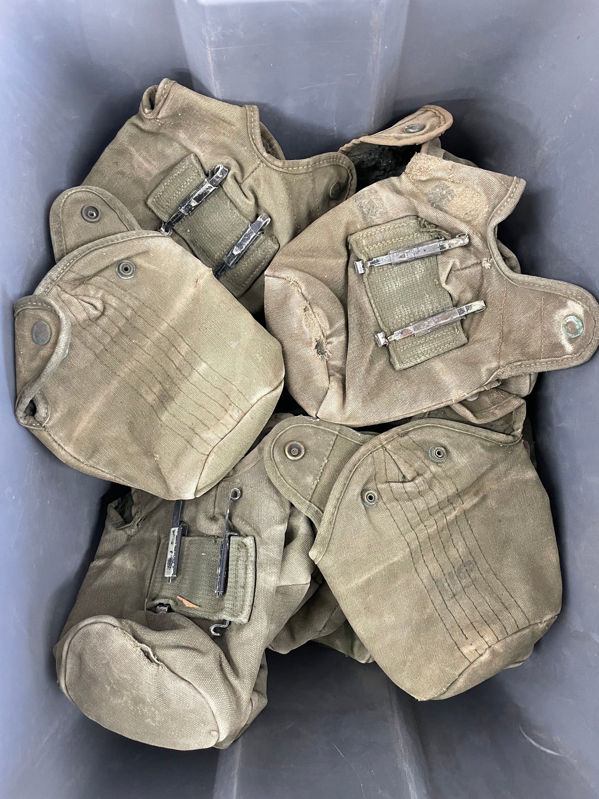 Original US military M1956 canteen cover, These are in Grade B original issued condition and do show signs of use but are functional. Please expect some scrapes, scratches, rips & tears (see photos). This listing is for the cover and attachment clips, no canteen or cup included.