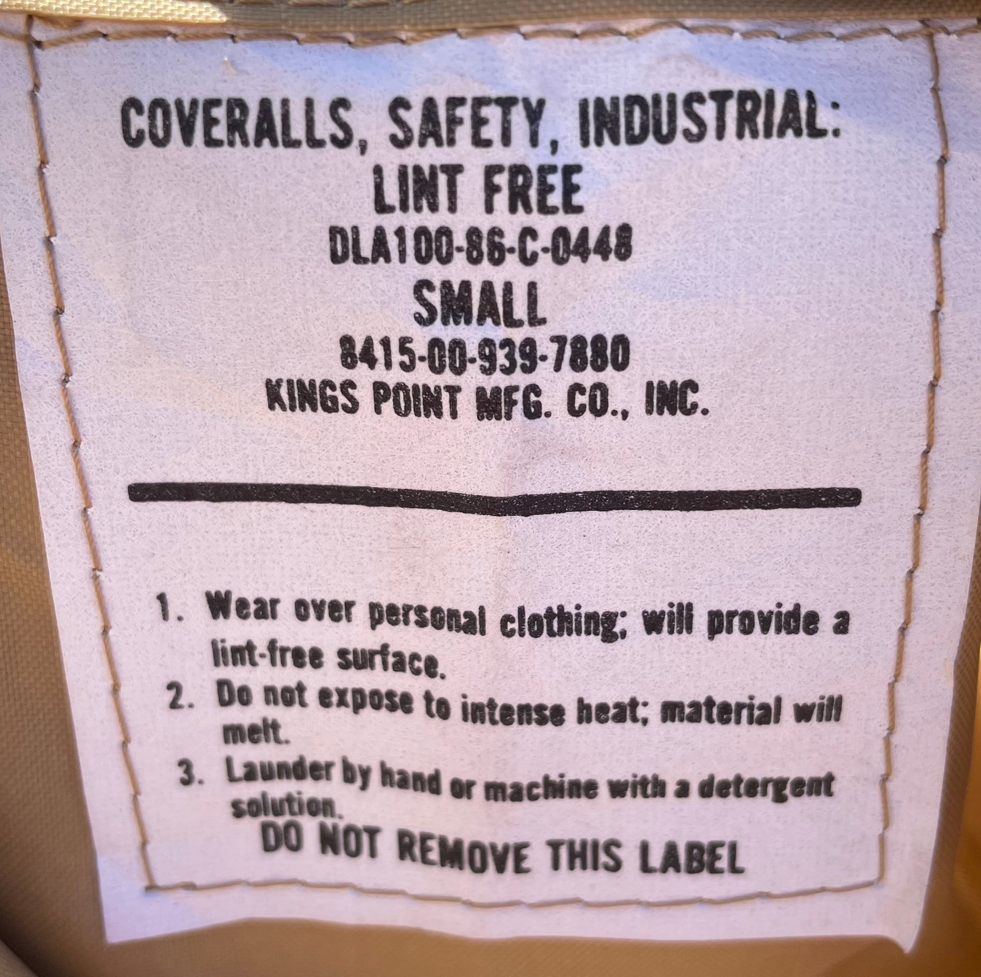 Coveralls, Safety, Industrial : Lint Free 100% Polyester. Original Condition, Like New.